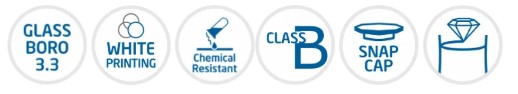 Item Code Capacity (ml) Tolerance (+_ml) Stopper Type Pack of PSAW.VF.22.01 50 0.10 Snap Cap 2 PSAW.VF.22.02 100 0.16 Snap Cap 2 PSAW.VF.22.03 200 0.20 Snap Cap 2 PSAW.VF.22.04 250 0.24 Snap Cap 2 PSAW.VF.22.05 500 0.40 Snap Cap 2 PSAW.VF.22.06 1000 0.60 Snap Cap 2 PSAW.VF.22.07 2000 0.100 Snap Cap 1
